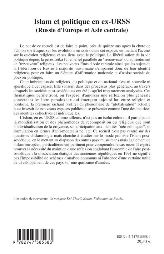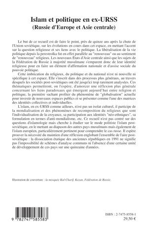Le but de cet ouvrage est de faire le point, près de quinze ans après la chute de l'Union soviétique, sur les évolutions en cours dans cet espace, en mettant l'accent sur la question religieuse et ses liens avec le politique. Cette imbrication du religieux, du politique et du national s'inscrit dans des processus généraux, au travers desquels les sociétés post-soviétiques ont été jusqu'ici trop rarement analysées. Ces thématiques permettront d'amorcer une réflexion plus générale concernant les liens paradoxaux qui émergent aujourd'hui entre religion et politique.