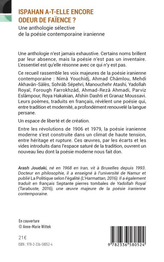 Une anthologie n'est jamais exhaustive. Certains noms brillent par leur absence, mais la poésie n'est pas un inventaire. L'essentiel est qu'elle résonne avec ce qui n'y est pas. Ce recueil rassemble les voix majeures de la poésie iranienne contemporaine: Nimâ Youchidj, Ahmad Châmlou, Mehdi Akhavân-Sâlès, Sohrâb Sépehri, Manouchehr Atashi, Yadollah Royaï, Forough Farrokhzâd, Ahmad-Rezâ Ahmadi, Parviz Eslâmpour, Roya Hakakian, Afshin Dashti et Granaz Moussavi. Leurs poèmes, traduits en français, révèlent une poésie qui, entre tradition et modernité, a profondément renouvelé la langue persane. Un espace de liberté et de création. Entre les révolutions de 1906 et 1979, la poésie iranienne moderne s'est construite dans un climat de haute tension, entre héritage et rupture. Ces oeuvres, par les écarts et les vides introduits dans l'espace saturé de la tradition, ouvrent un nouveau lieu dont la poésie moderne nous fait don.