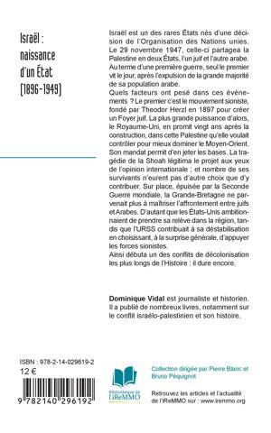 Israël est un des rares États nés d'une décision de l'Organisation des Nations unies qui, en 1947, partagea la Palestine en deux États, l'un juif et l'autre arabe. Au terme d'une première guerre, seul le premier vit le jour, après l'expulsion de la grande majorité de sa population arabe. Quels facteurs ont pesé dans ces événements ? Le premier c'est le mouvement sioniste, fondé par Theodor Herzl en 1897 pour créer un Foyer juif. La plus grande puissance d'alors, le Royaume-Uni, en jeta les bases dans cette Palestine qu'elle voulait contrôler pour mieux dominer le Moyen-Orient. La tragédie de la Shoah légitima le projet aux yeux de l'opinion internationale ; et nombre de ses survivants n'eurent pas d'autre choix que d'y contribuer. Sur place, épuisée par la Seconde Guerre mondiale, la Grande-Bretagne ne parvenait plus à maîtriser l'affrontement entre juifs et Arabes. D'autant que les États-Unis ambitionnaient de prendre sa relève dans la région, tandis que l'URSS contribuait à sa déstabilisation en choisissant, à la surprise générale, d'appuyer les forces sionistes. Ainsi débuta un des conflits de décolonisation les plus longs de l'Histoire : il dure encore.