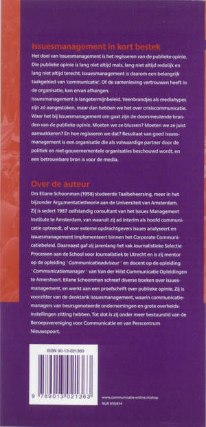 Issuesmanagement is langetermijnbeleid. Veenbrandjes als mediahypes zijn z? aangestoken, maar dan hebben we het over crisiscommunicatie. Waar het bij issuesmanagement om gaat zijn de doorsmeulende branden van de publieke opinie. Moeten we ze blussen? Moeten we ze juist aanwakkeren? En hoe regis-seren we dat? Resultaat van goed issuesmanagement is een organisatie die als volwaardige partner door de politiek en niet-gouvernementele organisaties beschouwd wordt, en een betrouwbare bron is voor de media.
