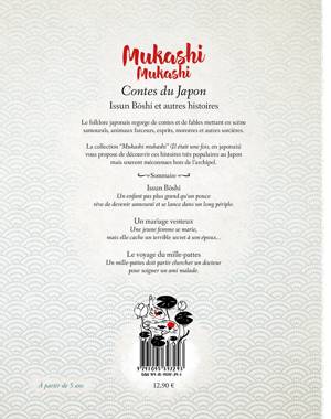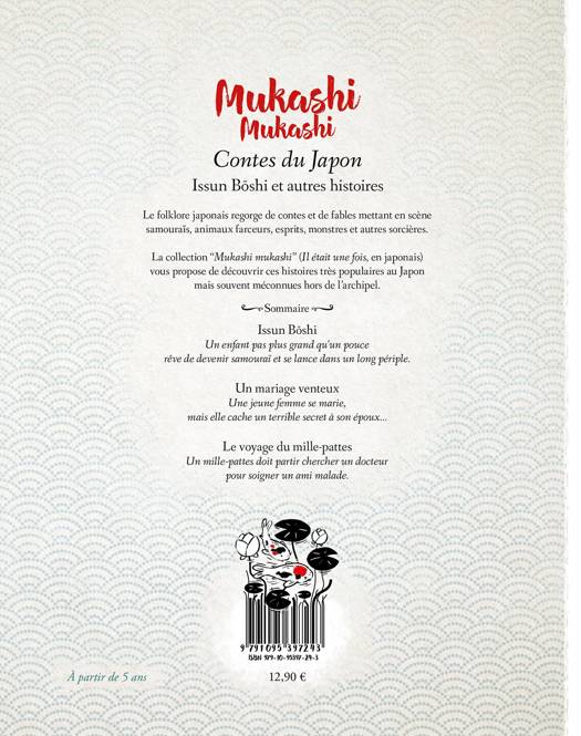 Le folklore japonais regorge de contes et de fables mettant en scène samouraïs, animaux farceurs et magiques, esprits, monstres et autres sorcières. La collection de recueils Mukashi mukashi (Il était une fois, en japonais) vous propose de découvrir ses histoires très populaires au Japon et souvent méconnues hors de l’archipel. Histoire 1 : Issun Boshi Un enfant pas plus grand qu’un pouce veut devenir samouraï. Histoire 2 : Le mariage venteux Une jeune femme se marie, mais elle a un terrible secret qu’elle veut cacher à son marie Histoire 3 : L’histoire du mille-pattes Un mille-pattes doit partir chercher un docteur pour un ami insecte malade.