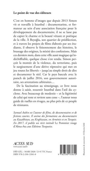 C'est en homme d'images que depuis 2013 Simon vit et travaille à Istanbul : documentariste, et formateur au sein d'une association française pour le développement du documentaire, il ne se lasse pas de capter le charme et la beauté vétuste et poétique de la ville. À Beyoğlu, son quartier de prédilection, et à travers les projets de films élaborés par ses étudiants, il observe le foisonnement des histoires, le brassage des origines, la mixité des confessions. Mais ces derniers mois, dans cette ville aussi magique qu'indéchiffrable, quelque chose s'est tendu. Simon perçoit la montée de la violence, du terrorisme, puis le surgissement d'une dérive répressive qui met en jeu toutes les libertés - jusqu'au simple droit de dire et documenter le réel. Car le pays bascule avec le putsch de juillet 2016, son gouvernement autoritaire, ses arrestations arbitraires...