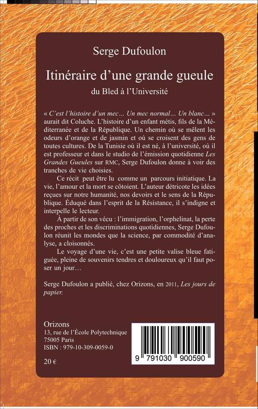 L'histoire d'un enfant métis, fils de la Méditerranée et de la République. Un chemin où se mêlent les odeurs d'orange et de jasmin et où se croisent des gens de toutes cultures. De la Tunisie où il est né, à l'université, où il est professeur et dans le studio de l'émission quotidienne « Les Grandes Gueules » sur RMC, Serge Dufoulon donne à voir des tranches de vie choisies.
