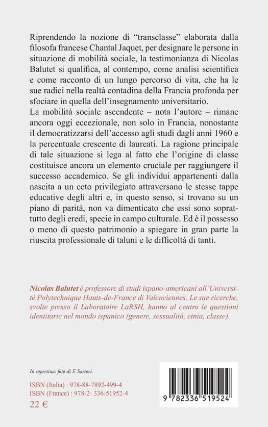 Riprendendo la nozione di « transclasse » elaborata dalla filosofa francese Chantal Jaquet, per designare le persone in situazione di mobilità sociale, la testimonianza di Nicolas Balutet si qualifica, al contempo, come analisi scientifica e come racconto di un lungo percorso di vita, che ha le sue radici nella realtà contadina della Francia profonda per sfociare in quella dell'insegnamento universitario.