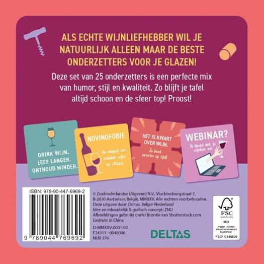 Deze leuke set van 25 originele wijnonderzetters is een perfecte mix van humor, stijl en kwaliteit, en daarmee het ideale cadeau voor de echte wijnliefhebber. Met deze onderzetters hou je de tafel altijd schoon en de sfeer top!