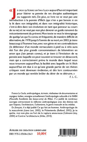 « Je crois qu’écrire sur Ivan Illich aujourd’hui est important pour libérer sa pensée de ses disciples authentiques ou supposés tels. De plus, ce livre ne se veut pas une introduction à la pensée d’Illich (qui n’en a pas besoin si on la lit dans son intégralité, et dans son intégralité historique, c’est-à-dire dans son évolution en tant que penseur au cours de sa vie) et ne veut pas non plus devenir un guide raisonné du mécontentement du présent. Mon texte se veut le témoignage de quelqu’un qui l’a connu et fréquenté, de manière difficile et alternative, de 1978 jusqu’à l’année de sa mort, en 2002. Je tiens beaucoup à l’homme Ivan, avec son génie et ses contradictions (le défenseur d’un monde vernaculaire à pied ou à vélo aura été l’un des plus grands consommateurs de kilomètres en avion que j’aie jamais connu), et je tiens à l’évolution de sa pensée avec laquelle on peut souvent se trouver en désaccord, mais qui a correctement prévu le monde dans lequel nous nous trouvons aujourd’hui ; la facilité avec laquelle on lit Illich aujourd’hui est due à ce qu’une grande partie de ses thèses critiques sont devenues évidentes, et dès lors contournées par un monde qui semble brûler du désir de se détruire. »