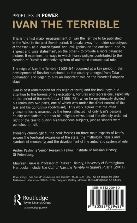 Ivan is best remembered for his reign of terror, the book pays due attention to the horrors of his executions, tortures and repressions, especially in the period of the oprichnina (1565-72), when he mysteriously divided his realm into two parts, one of which was under the direct control of the tsar and his oprichniki (bodyguard). This work argues that the often gruesome forms assumed by the terror reflected not only Ivan's personal cruelty and sadism, but also his religious views about the divinely ordained right of the tsar to punish his treasonous subjects, just as sinners were punished in Hell.