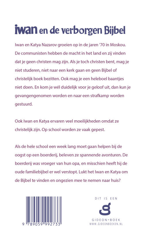 Iwan en Katya Nazarov groeien op in de jaren ’70 in Moskou, de hoofdstad van het land dat toen de Sovjet-Unie heette en nu Rusland. De communisten hebben de macht in het land en zij hebben het verboden om christen te zijn. Als je toch christen bent, mag je niet studeren, niet naar de kerk gaan, geen Bijbel bezitten en geen lid zijn van de communistische partij. Ook mag je een heleboel baantjes niet doen. En kom je wel duidelijk voor je geloof uit, dan loop je het risico gevangen genomen en naar een strafkamp te worden gestuurd. Ook Iwan en Katya ervaren veel moeilijkheden omdat ze christelijk zijn. Op school wordt het hun niet gemakkelijk gemaakt. Als de hele school een week lang moet gaan helpen bij de oogst op een Leninboerderij, die vroeger van de opa van Iwan en Katya is geweest, beleven ze spannende avonturen. De oude familiebijbel van hun opa zou mogelijk verstopt zijn op de boerderij. Lukt het Iwan en Katya om de Bijbel te vinden ongezien mee te nemen?