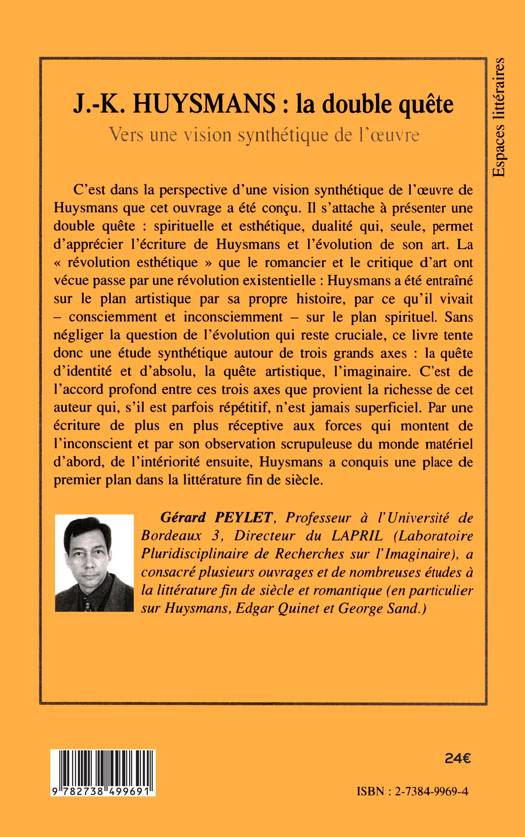 C'est dans la perspective d'une vision synthétique de l'œuvre de Huysmans que cet ouvrage a été conçu. Il s'attache à présenter une double quête : spirituelle et esthétique, dualité, qui, seule, permet d'apprécier l'écriture de Huysmans et l'évolution de son art. Par une écriture de plus en plus réceptive aux forces qui montent de l'inconscient et par son observation scrupuleuse du monde matériel d'abord, de l'intériorité ensuite, Huysmans à conquis une place de premier plan dans la littérature fin de siècle.