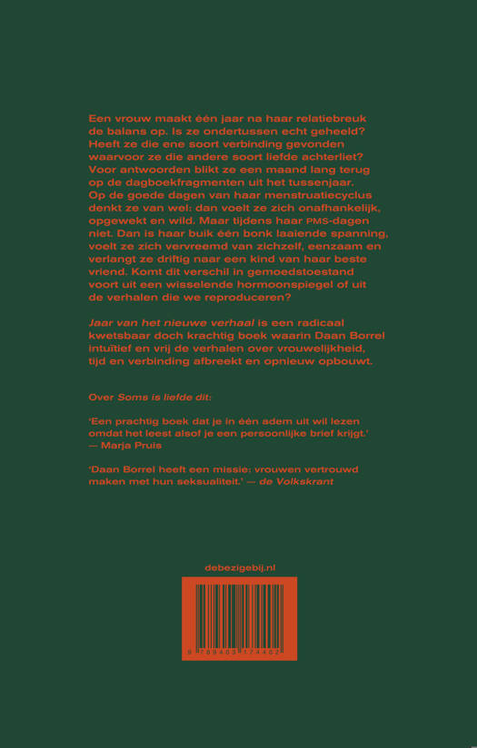 Jaar van het nieuwe verhaal is een radicaal kwetsbaar doch krachtig boek waarin Daan Borrel de verhalen over vrouwelijkheid, tijd en verbinding afbreekt en opnieuw opbouwt.