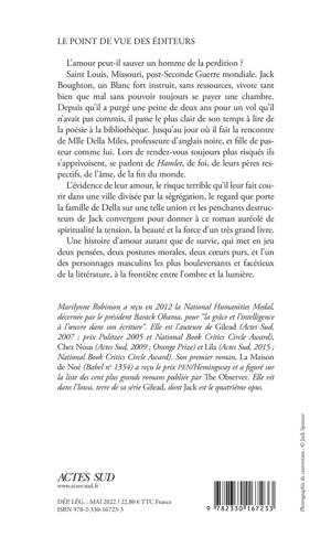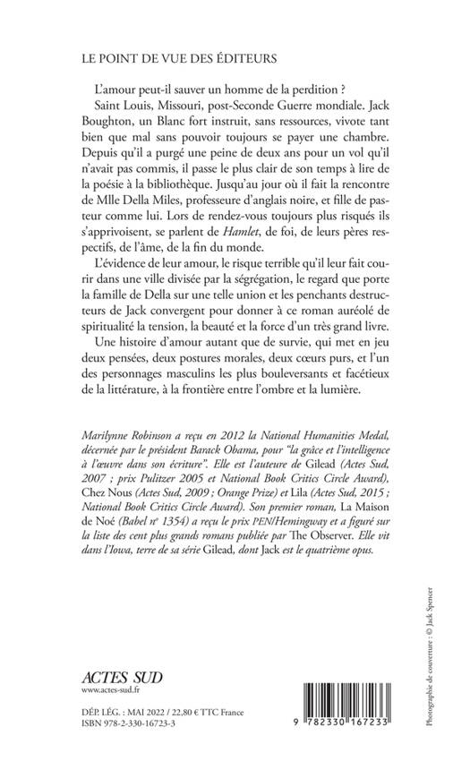 L'amour peut-il sauver un homme de la perdition ? Saint Louis, Missouri, post-Seconde Guerre mondiale. Jack Boughton, un Blanc fort instruit, sans ressources, vivote tant bien que mal sans pouvoir toujours se payer une chambre. Depuis qu'il a purgé une peine de deux ans pour un vol qu'il n'avait pas commis, il passe le plus clair de son temps à lire de la poésie à la bibliothèque. Jusqu'au jour où il fait la rencontre de Mlle Della Miles, professeure d'anglais noire, et fille de pasteur comme lui. Lors de rendez-vous toujours plus risqués ils s'apprivoisent, se parlent de Hamlet, de foi, de leurs pères respectifs, de l'âme, de la fin du monde. L'évidence de leur amour, le risque terrible qu'il leur fait courir dans une ville divisée par la ségrégation, le regard que porte la famille de Della sur une telle union et les penchants destructeurs de Jack convergent pour donner à ce roman auréolé de spiritualité la tension, la beauté et la force d'un très grand livre. Une histoire d'amour autant que de survie, qui met en jeu deux pensées, deux postures morales, deux coeurs purs, et l'un des personnages masculins les plus bouleversants et facétieux de la littérature, à la frontière entre l'ombre et la lumière.