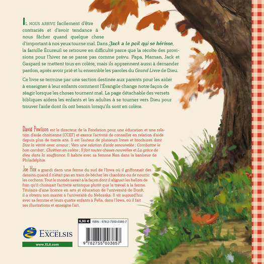 Il nous arrive facilement d’être contrariés et d’avoir tendance à nous fâcher quand quelque chose d’important à nos yeux tourne mal. Dans Jack a le poil qui se hérisse, la famille Écureuil se retrouve en difficulté parce que la récolte des provisions pour l’hiver ne se passe pas comme prévu. Papa, Maman, Jack et Gaspard se mettent tous en colère, mais ils apprennent aussi à demander pardon, après avoir prié et lu ensemble les paroles du Grand Livre de Dieu. Ce livre se termine par une section destinée aux parents pour les aider à enseigner à leur enfants comment l’Évangile change notre façon de réagir lorsque les choses tournent mal. La page détachable des versets bibliques aidera les enfants et les adultes à se tourner vers Dieu pour trouver l’aide dont ils ont besoin lorsqu’ils sont en colère.