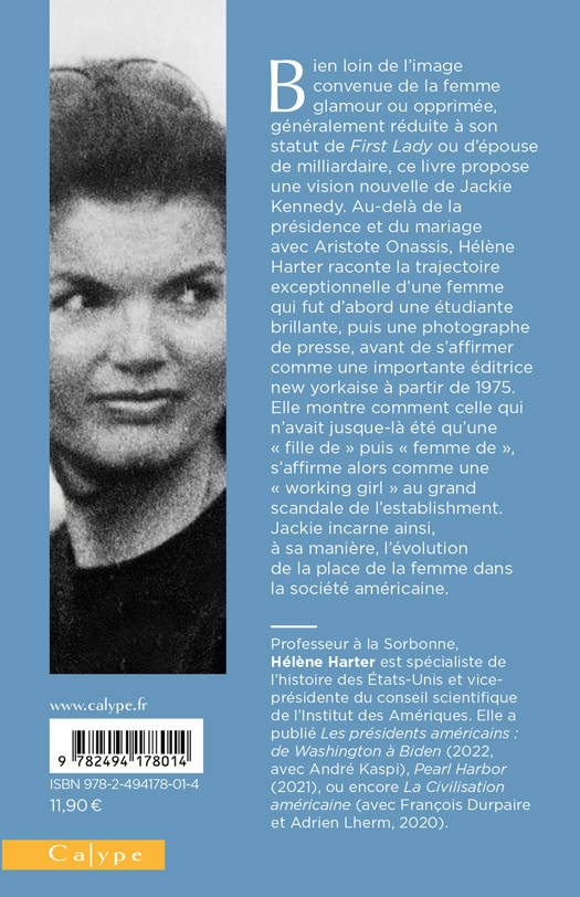 Bien loin de l’image convenue de la femme glamour ou opprimée, généralement réduite à son statut de First Lady ou d’épouse de milliardaire, ce livre propose une vision nouvelle de Jackie Kennedy. Au-delà de la présidence et du mariage avec Aristote Onassis, Hélène Harter raconte la trajectoire exceptionnelle d’une femme qui fut d’abord une étudiante brillante, puis une photographe de presse, avant de s’affirmer comme une importante éditrice new yorkaise à partir de 1975. Elle montre comment celle qui n’avait jusque-là été qu’une « fille de » puis « femme de », s’affirme alors comme une « working girl » au grand scandale de l’establishment. Jackie incarne ainsi, à sa manière, l’évolution de la place de la femme dans la société américaine.