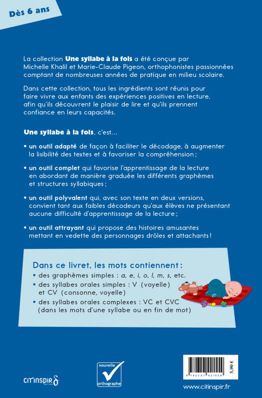 Série bleue Jaco garde un bébé. Jacasse rit de lui. Jaco, lui, ne rit pas... Dans ce livre, les mots contiennent : des graphèmes simples : a, e, i, o, l, m, s, etc. des syllabes orales simples : V (voyelle) et CV (consonne, voyelle) des syllabes orales complexes : VC et CVC (dans les mots d’une syllabe ou en fin de mot)
