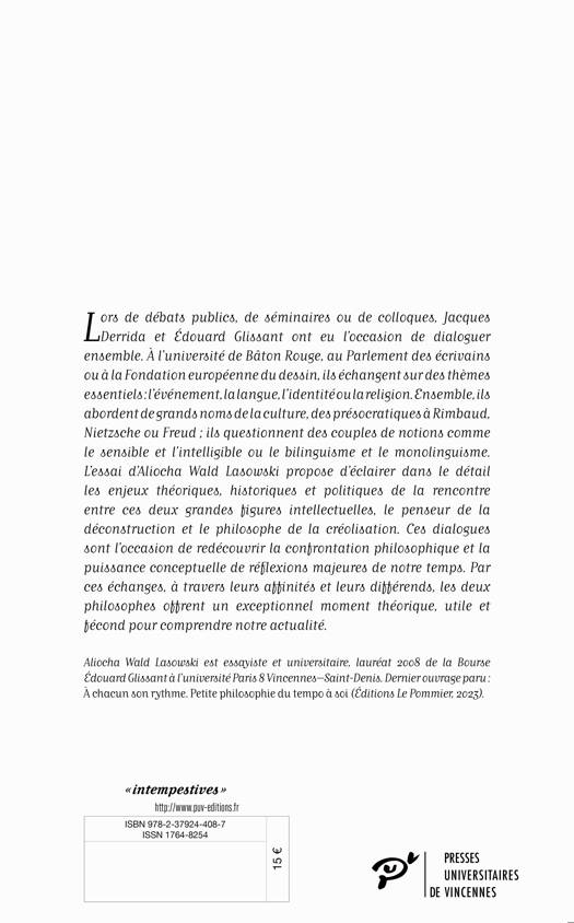 L’essai d’Aliocha Wald Lasowski propose d’éclairer dans le détail les enjeux théoriques, historiques et politiques de la rencontre entre ces deux grandes figures intellectuelles, le penseur de la déconstruction et le philosophe de la créolisation. Ces dialogues sont l’occasion de redécouvrir la confrontation philosophique et la puissance conceptuelle de réflexions majeures de notre temps. Par ces échanges, à travers leurs affinités et leurs différends, les deux philosophes offrent un exceptionnel moment théorique, utile et fécond pour comprendre notre actualité.