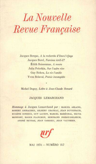 Jacques Berque, À la recherche d'Imru'l-Qays Jacques Borel, Narcisse écrit-il? Édith Boissonnas, À revers Julia Mood Peterkin, Sur l'autre rive Guy Rohou, La vie l'amble Yvon Belaval, Poésie incomplète Michel Deguy, Lettre à l'auteur des Notes sur la foi