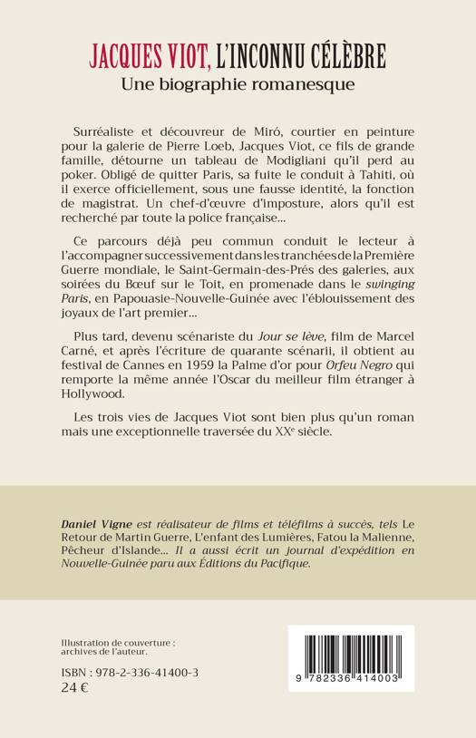 Surréaliste et découvreur de Miró, courtier en peinture pour la galerie de Pierre Loeb, Jacques Viot, ce fils de grande famille, détourne un tableau de Modigliani qu'il perd au poker. Obligé de quitter Paris, sa fuite le conduit à Tahiti, où il exerce officiellement, sous une fausse identité, la fonction de magistrat. Un chef-d'oeuvre d'imposture, alors qu'il est recherché par toute la police française... Ce parcours déjà peu commun conduit le lecteur à l'accompagner successivement dans les tranchées de la Première Guerre mondiale, le Saint-Germain-des-Prés des galeries, aux soirées du Boeuf sur le Toit, en promenade dans le swinging Paris, en Papouasie-Nouvelle-Guinée avec l'éblouissement des joyaux de l'art premier... Plus tard, devenu scénariste du Jour se lève, film de Marcel Carné, et après l'écriture de quarante scénarii, il obtient au festival de Cannes en 1959 la Palme d'or pour Orfeu Negro qui remporte la même année l'Oscar du meilleur film étranger à Hollywood. Les trois vies de Jacques Viot sont bien plus qu'un roman mais une exceptionnelle traversée du XXe siècle.