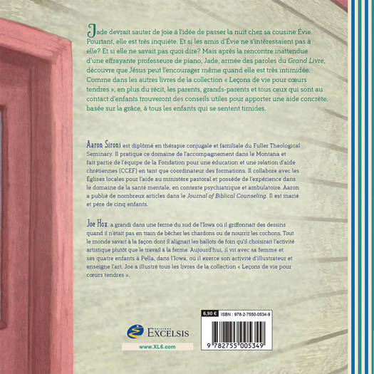 Jade devrait sauter de joie à l’idée de passer la nuit chez sa cousine Évie. Pourtant, elle est très inquiète. Et si les amis d’Évie ne s’intéressaient pas à elle ? Et si elle ne savait pas quoi dire ? Mais après la rencontre inattendue d’une effrayante professeure de piano, Jade, armée des paroles du Grand Livre, découvre que Jésus peut l’encourager même quand elle est très intimidée. Comme dans les autres livres de la collection « Leçons de vie pour coeurs tendres », en plus du récit, les parents, grands-parents et tous ceux qui sont au contact d’enfants trouveront des conseils utiles pour apporter une aide concrète, basée sur la grâce, à tous les enfants qui se sentent timides.