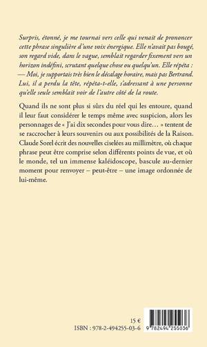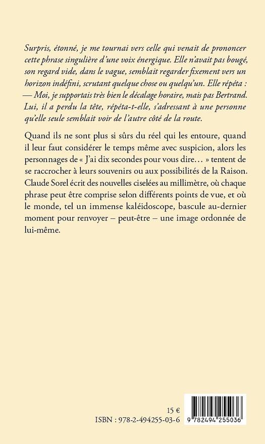 Quand ils ne sont plus si sûrs du réel qui les entoure, quand il leur faut considérer le temps même avec suspicion, alors les personnages de « J’ai dix secondes pour vous dire… » tentent de se raccrocher à leurs souvenirs ou aux possibilités de la Raison. Claude Sorel écrit des nouvelles ciselées au millimètre, où chaque phrase peut être comprise selon différents points de vue, et où le monde, tel un immense kaléidoscope, bascule au-dernier moment pour renvoyer – peut-être – une image ordonnée de lui-même.