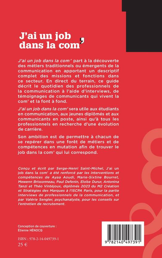 J’ai un job dans la com’ part à la découverte des métiers traditionnels ou émergents de la communication en apportant un descriptif complet des missions et fonctions dans ce secteur. En direct du terrain, ce guide décrit le quotidien des professionnels de la communication à l’aide d’interviews, de témoignages de communicants qui vivent la com’ et la font à fond. J’ai un job dans la com’ sera utile aux étudiants en communication, aux jeunes diplômés et aux communicants en poste, ainsi qu’à tous les professionnels en recherche d’une évolution de carrière. Son ambition est de permettre à chacun de se repérer dans une forêt de métiers et de compétences en mutation afin de trouver le job dans la com’ qui lui correspond.