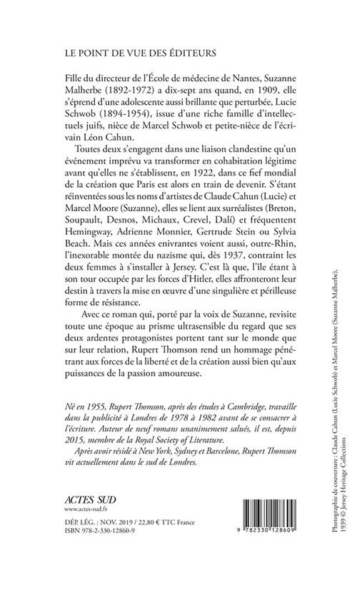 Toutes deux s'engagent dans une liaison clandestine qu'un événement imprévu va transformer en cohabitation légitime avant qu'elles ne s'établissent, en 1922, dans ce fief mondial de la création que Paris est alors en train de devenir. S'étant réinventées sous les noms d'artistes de Claude Cahun (Lucie) et Marcel Moore (Suzanne), elles se lient aux surréalistes (Breton, Soupault, Desnos, Michaux, Crevel, Dalí) et fréquentent Hemingway, Adrienne Monnier, Gertrude Stein ou Sylvia Beach. Mais ces années enivrantes voient aussi, outre-Rhin, l'inexorable montée du nazisme qui, dès 1937, contraint les deux femmes à s'installer à Jersey. C'est là que, l'île étant à son tour occupée par les forces d'Hitler, elles affronteront leur destin à travers la mise en oeuvre d'une singulière et périlleuse forme de résistance.