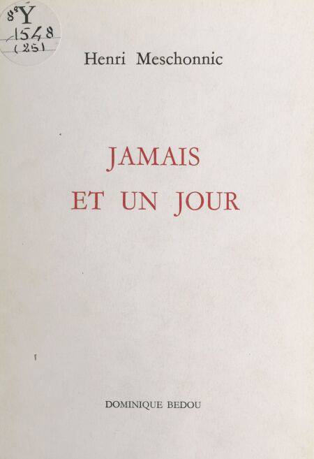 « jamais et un jour » est un ensemble court, de trente-sept moments ou passages de la poésie, qui se tiennent par leur unité. Du premier je savais qu’il était le premier, du dernier qu’il était le dernier. Leur nécessité, non leur masse, fait un livre. Ce qui est dit ne se réduit pas à des thèmes. L’amour, la mort. Ces fosses communes du discours sur la poésie. Seuls réduisent l’écriture de la vie à un contenu ceux qui confondent une peinture et son sujet. Les poèmes tiennent plutôt du goût, de l’odeur, du climat — science des saveurs ou météorologie du langage — que de la réduction coutumière à un dit. Ils n’existent que par leur dire. Les mots de tous les jours, non tant pour faire la fête que pour s’y reconnaître : que chaque poème vous ressemble. H. Meschonnic