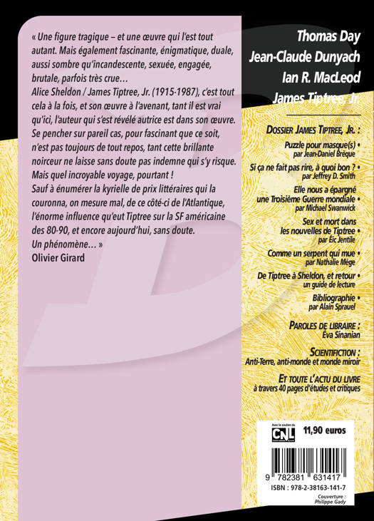 Alice Sheldon / James Tiptree, Jr. (1915-1987), c'est tout cela à la fois, et son oeuvre à /'avenant, tant il est vrai qu'ici, l'auteur qui s'est révélé autrice est dans son oeuvre. Se pencher sur pareil cas, pour fascinant que ce soit, n'est pas toujours de tout repos, tant cette brillante noirceur ne laisse sans doute pas indemne qui s'y risque. Mais quel incroyable voyage, pourtant !