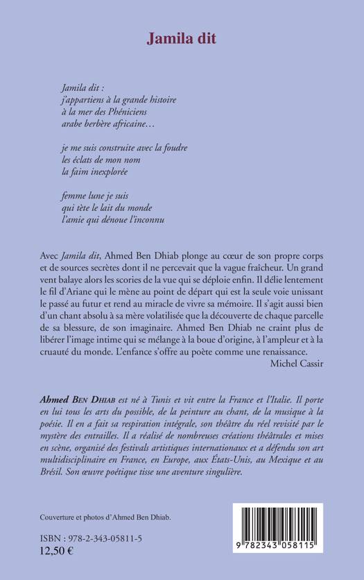 "Ahmed Ben Dhiab plonge au cur de son propre corps et de sources secrètes dont il ne percevait que la vague fraîcheur. Il délie lentement le fil d'Ariane qui le mène au point de départ qui est la seule voie unissant le passé au futur et rend au miracle de vivre sa mémoire. Chant absolu à sa mère volatilisée, c'est aussi la découverte de chaque parcelle de sa blessure, de son imaginaire." Michel Cassir. L'auteur porte en lui tous les arts du possible, en a fait sa respiration intégrale, son théâtre du réel revisité par le mystère des entrailles.
