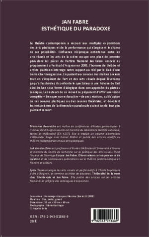 L'influence réciproque entretenue entre les arts visuels et les arts de la scène occupe une place de premier plan dans les pièces de l'artiste flamand Jan Fabre. L'homme de théâtre et artiste plasticien interroge notre rapport au réel. Les auteurs de ce recueil se proposent d'offrir une vision complète - bien que non exhaustive - de ses créations, qu'il s'agisse de ses oeuvres plastiques ou des oeuvres théâtrales, et dévoilent les mécanismes de la dimension paradoxale qui est un de leur plus puissant ressort.