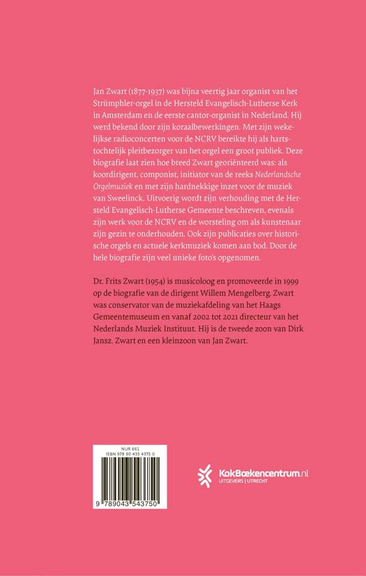 Jan Zwart (1877-1937) was bijna veertig jaar organist van het Strümphler-orgel in de Hersteld Evangelisch Lutherse Kerk in Amsterdam en de eerste cantor-organist in Nederland. Hij werd bekend door zijn koraalbewerkingen. Met zijn wekelijkse radioconcerten voor de NCRV bereikte hij als hartstochtelijk pleitbezorger van het orgel een groot publiek. Deze biografie laat zien hoe breed Zwart georiënteerd was: als koordirigent, componist, initiator van de reeks Nederlandsche Orgelmuziek en met zijn hardnekkige inzet voor de muziek van Sweelinck. Uitvoerig wordt zijn verhouding met de Hersteld Evangelisch-Lutherse Gemeente beschreven, evenals zijn werk voor de NCRV en de worsteling om als kunstenaar zijn gezin te onderhouden. Ook zijn publicaties over historische orgels en actuele kerkmuziek komen aan bod. Door de hele biografie zijn veel unieke foto’s opgenomen.