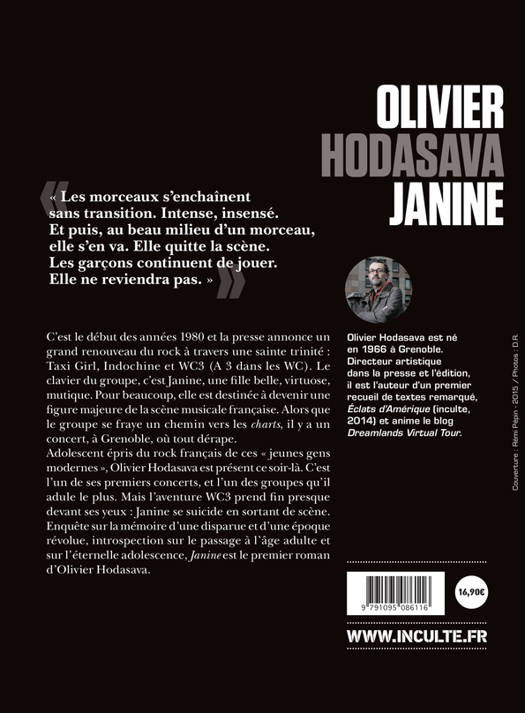 Adolescent épris des « Jeunes Gens Modernes » du rock français, Olivier Hodasava vivra un de ses premiers concerts dans sa ville natale de Grenoble, celui de WC3. Le soir même, la chanteuse du groupe, Janine, se suicide en sortant de scène. Enquête sur la mémoire d'une disparue et d'une époque révolue, introspection sur son propre passage à l'âge adulte, Janine est le premier roman d'Olivier Hodasava chez inculte.