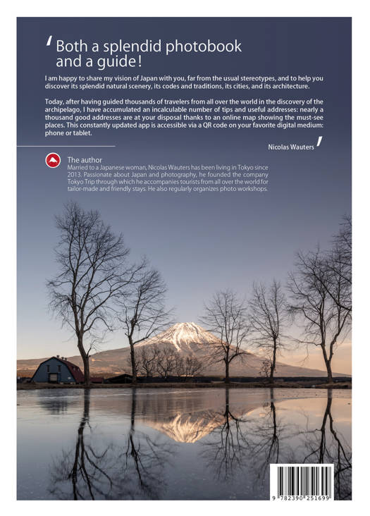 A new travel guide to Japan, illustrated by extraordinary photos, that avoids clichés while exploring the country's mythical places. Admire Tokyo in all of its tranquility, Kyoto under the charm of the geishas, Osaka full of tumult, but also Mount Fuji and many other must-see destinations. Going beneath the surface, Nicolas Wauters describes the Japanese way of life, their traditions and their festivals. The images are accompanied by a QR code that allows access to constantly updated data. No need to search in the pages of your book, you are geolocated and nearby places of interest are immediately displayed.