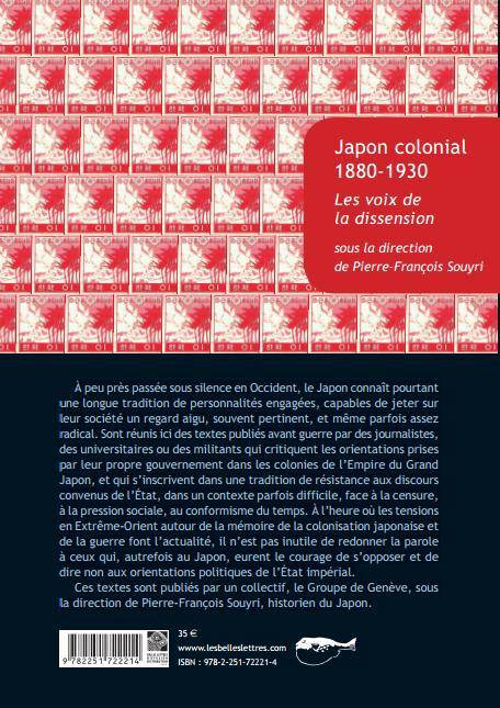 English summary: Japan is well-known for its poets, artists, and writers, but few are aware of the rich activity of the many intellectuals engaged in political and social criticism. The present volume offers a selection of original texts that reflect diverse and engaging thought on Japans colonial empire, illustrating a contested and complicated public debate. French description: Si le Japon est connu de par le monde pour ses romanciers, ses poetes ou ses artistes, il l'est beaucoup moins pour ses intellectuels engages dans la critique politique et sociale. Pourtant le Japon a connu, depuis au moins un siecle et demi, une longue tradition, a peu pres passee sous silence en Occident, de personnalites engagees capables de jeter sur leur societe un regard aigu, souvent pertinent, et meme parfois assez radical. Ces textes originaux qui refletent d'ailleurs la richesse du debat public au Japon n'ont jamais ete traduits. Et pourtant ils ont compte et comptent toujours. Des articles publies avant guerre par des journalistes, des universitaires ou des militants sont ici traduits et presentes par des chercheurs a l'Universite de Geneve. Ces textes critiquent les orientations prises par leur propre gouvernement dans les colonies de l'Empire du Grand Japon. Ils s'inscrivent dans une tradition de resistance aux discours convenus de l'Etat, dans un contexte parfois difficile, face a la censure, a la pression sociale, au conformisme du temps. Ils dessinent clairement les contours d'une opinion publique japonaise diverse et parfois virulente. A l'heure ou les tensions en Extreme-Orient autour de la memoire de la colonisation japonaise et de la guerre font l'actualite, il n'est pas inutile de redonner la parole a ceux qui, autrefois au Japon, eurent le courage de s'opposer et de dire non aux orientations politiques de l'Etat imperial. L'ouvrage est publie sous la direction de Pierre-Francois Souyri, professeur a l'Universite de Geneve ou il enseigne l'histoire japonaise. P-F. Souyri est l'auteur de plusieurs ouvrages, notamment Nouvelle Histoire du Japon (Perrin, 2010) et Histoire du Japon medieval, le monde a l'envers (Perrin, collection Tempus, 2013). L'ouvrage est le fruit d'un collectif de chercheurs specialistes du Japon moderne, le Groupe de Geneve.