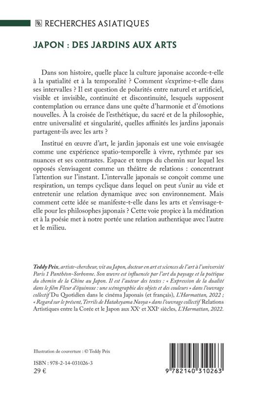 Dans son histoire, quelle place la culture japonaise accorde-t-elle à la spatialité et à la temporalité ? Comment s'exprime-t-elle dans ses intervalles ? Il est question de polarités entre naturel et artificiel, visible et invisible, continuité et discontinuité, lesquels supposent contemplation ou errance dans une quête d'harmonie et d'émotions nouvelles. À la croisée de l'esthétique, du sacré et de la philosophie, entre universalité et singularité, quelles affinités les jardins japonais partagent-ils avec les arts ? Institué en oeuvre d'art, le jardin japonais est une voie envisagée comme une expérience spatio-temporelle à vivre, rythmée par ses nuances et ses contrastes. Espace et temps du chemin sur lequel les opposés s'envisagent comme un théâtre de relations: concentrant l'attention sur l'instant. L'intervalle japonais se conçoit comme une respiration, un temps cyclique dans lequel on peut s'unir au vide et entretenir une relation dynamique avec son environnement. Mais comment cette idée se manifeste-t-elle dans les arts et s'envisage-t-elle pour les philosophes japonais ? Cette voie propice à la méditation et à la poésie met à notre portée une relation authentique avec l'autre et le milieu.