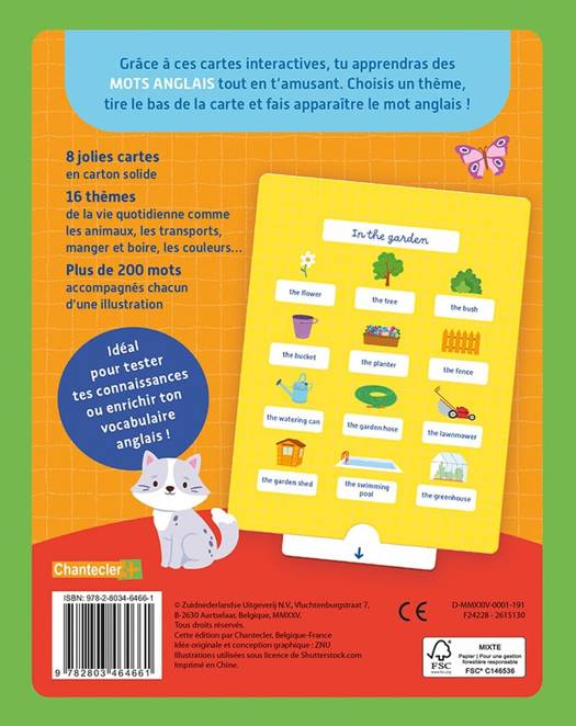 Grâce à ces cartes interactives, tu apprendras des mots anglais tout en t'amusant. Choisis un thème, tire le bas de la carte et la traduction apparaît ! - 8 jolies cartes en carton solide - 16 thèmes de la vie quotidienne comme les animaux, les transports, manger et boire, les couleurs... - 192 mots accompagnés chacun d'une illustration claire Idéal pour tester tes connaissance ou enrichir ton vocabulaire anglais !