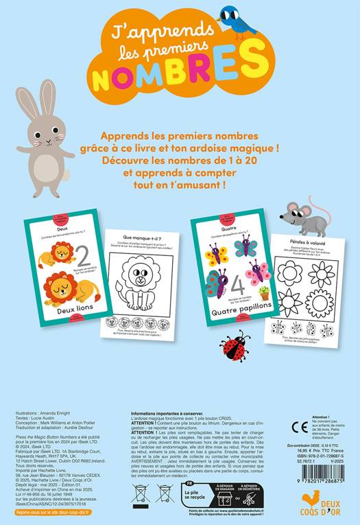 Apprends les premiers nombres grâce à ce livre et ton ardoise magique ! Découvre les nombres de 1 à 20 et apprends à compter tout en t'amusant !