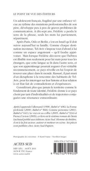Après Paris, Oslo et Berlin, c'est en Israël qu'il doit suivre aujourd'hui sa famille. Comme chaque destination inconnue, Tel-Aviv s 'impose tout d'abord à lui comme un espace angoissant - qu'il faudra apprivoiser. Mais lorsque Frédéric découvre que l'hébreu est illisible non seulement pour lui mais pour tous les étrangers, que cette langue se lit dans l'autre sens, et que son apprentissage pourrait augurer d'un véritable recommencement, ce pays réveille en lui l'espoir de trouver une place dans le monde. Rassuré, il part muni d'un dictaphone à la rencontre des habitants de Tel-Aviv, pour les interroger sur leur histoire et leur relation à cet Etat fait de contradictions et d'espérances.