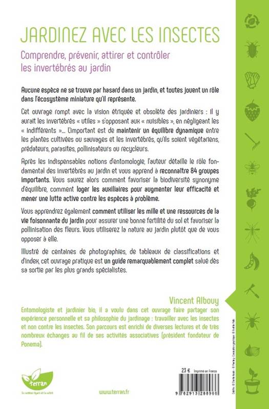 Un ouvrage pratique, pour comprendre, prévenir, attirer et contrôler les insectes au jardin. Vous apprendrez comment utiliser les ressources foisonnantes du jardin pour assurer une bonne fertilité du sol, maintenir les populations d’espèces gênantes à un niveau assez bas pour ne pas causer trop de dégâts, favoriser la pollinisation des fleurs. Plus de 80 fiches détaillées, des conseils précis et toujours le même objectif : utiliser la nature au jardin plutôt que de s’opposer à elle.