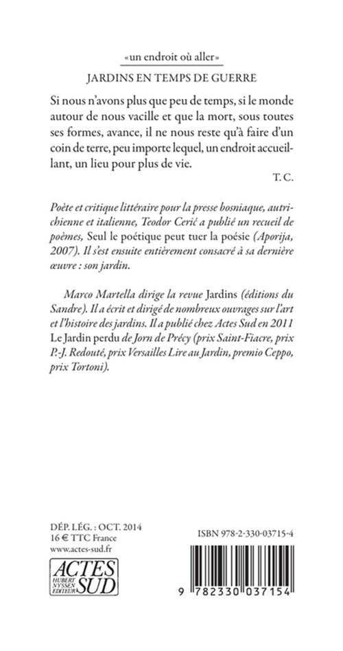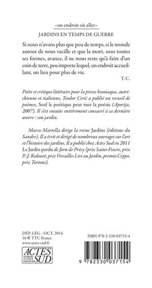 En 1992, lorsque la guerre éclate en Bosnie, l'étudiant poète Teodor Ceric quitte Sarajevo. Pendant sept ans, il voyage à travers l'Europe, et au fil de son exil, il découvre des jardins souvent méconnus - à la marge, nés des rêves de leurs singuliers créateurs. Du jardin de Beckett, en Seine-et-Marne, au parc paysager de Painshill, près de Londres, Ceric raconte ces lieux et en révèle la dimension poétique et existentielle. Marco Martella, «découvreur» du «Jardin perdu» de Jorn de Précy (prix Saint-Fiacre, prix P. J. Redouté, prix Versailles Lire au Jardin, premio Ceppo, prix Tortoni) a réuni et préfacé les textes de Ceric.