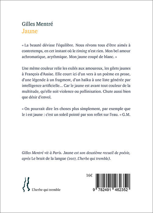 « La beauté dévisse l’équilibre. Nous rêvons tous d’être aimés à contretemps, en cet instant ou le timing n’est rien. Mon bel amour achromatique, arythmique. Mon jaune coupé de blanc. Une même couleur relie les exilés de la réussite aux amoureux solitaires, les gilets jaunes à François d’Assise. Elle court ici d’un texte à l’autre, d’un vers à un poème en prose, d’une légende à un fragment, d’un haïku à une liste générée par intelligence artificielle… car le jaune est avant tout couleur de la multitude, qu’elle soit violence ou pollinisation. Chute aussi bien que désir d’envol. On pourrait dire les choses plus simplement, par exemple que le i est jaune : c’est un soleil pointé par son reflet sur l’eau. »