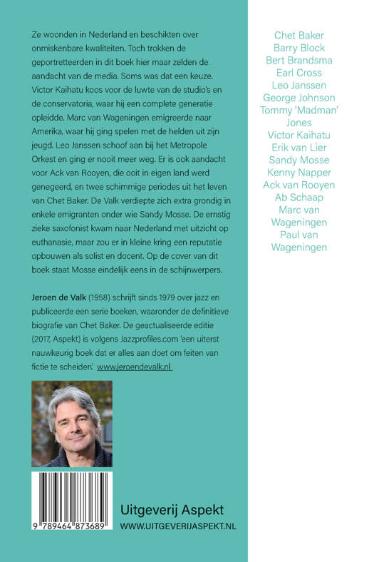 Ze woonden in Nederland en beschikten over onmiskenbare kwaliteiten. Toch trokken de geportretteerden in dit boek hier maar zelden de aandacht van de media. Soms was dat een keuze. Victor Kaihatu koos voor de luwte van de studio’s en de conservatoria, waar hij een complete generatie opleidde. Marc van Wageningen emigreerde naar Amerika, waar hij ging spelen met de helden uit zijn jeugd. Leo Janssen schoof aan bij het Metropole Orkest en ging er nooit meer weg. Er is ook aandacht voor Ack van Rooyen, die ooit in eigen land werd genegeerd, en twee schimmige periodes uit het leven van Chet Baker. De Valk verdiepte zich extra grondig in enkele emigranten onder wie Sandy Mosse. De ernstig zieke saxofonist kwam naar Nederland met uitzicht op euthanasie, maar zou er in kleine kring een reputatie opbouwen als solist en docent. Op de cover van dit boek staat Mosse eindelijk eens in de schijnwerpers.