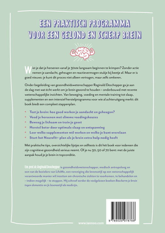 Met praktische tips, overzichtelijke lijstjes en zelftests is dit hét boek voor iedereen die zijn cognitieve gezondheid serieus neemt. Of je nu 30, 50 of 70 bent: met de juiste aanpak houd je je brein in topconditie.