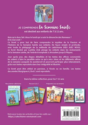 Père Aldric de Bizemont – Anne de Braux – Laetitia Zink Mais qu’a donc fait Jésus le lundi qui a suivi le dimanche des Rameaux ? Et le mercredi ? Ce livret a pour but de faire comprendre le mystère de la Passion et l’histoire de la Semaine Sainte aux enfants. De façon simple et profonde, avec toute la pédagogie de la méthode de catéchisme DIEU AVEC NOUS, ce livret illustré par Laetitia Zink plonge les enfants dans les événements de la Semaine sainte, de l’entrée triomphale à Jérusalem jusqu’à Pâques. Jour après jour, des étapes détaillées et les textes des offices commentés les aident à faire le parallèle entre ce qu’a vécu Jésus et les différents offices de la semaine auxquels ils assisteront et pourront participer plus intensément, grâce aux textes reproduits dans leur intégralité et illustrés. Ce livret peut être utilisé en paroisse, à l’école ou en famille. Les textes des années liturgiques A, B et C sont reproduits.