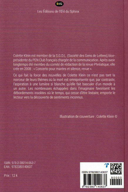 Ce qui fait la force des nouvelles de Colette Klein ce n'est pas tant la noirceur de leurs thèmes où la mort est omniprésente que, par contraste, l'aspiration à une lumière si blanche qu'elle fait basculer d'un monde à un autre. Les nombreuses échappées dans l'imaginaire favorisent les débordements insolites où le temps, qui cesse d'être linéaire, emporte le lecteur vers la découverte de sentiments inconnus.