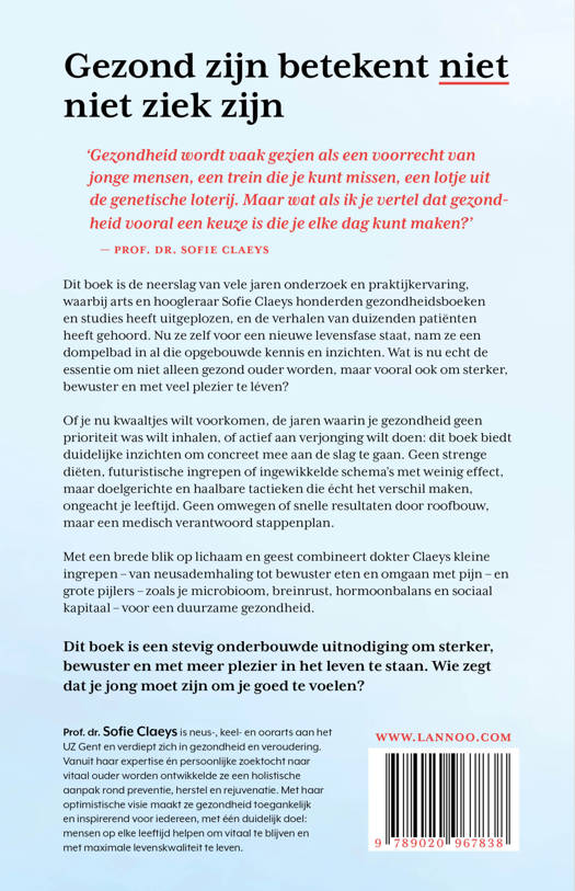 'Gezondheid wordt vaak gezien als een voorrecht van jonge mensen, een trein die je kunt missen, een lotje uit de genetische loterij. Maar wat als ik je vertel dat gezondheid vooral een keuze is die je elke dag kunt maken?' - prof. dr. Sofie Claeys Dit boek is de neerslag van vele jaren onderzoek en praktijkervaring, waarbij arts en hoogleraar Sofie Claeys honderden gezondheidsboeken en studies heeft uitgeplozen, en de verhalen van duizenden patiënten heeft gehoord. Nu ze zelf voor een nieuwe levensfase staat, nam ze een dompelbad in al die opgebouwde kennis en inzichten. Wat is nu echt de essentie om niet alleen gezond ouder worden, maar vooral ook om sterker, bewuster en met veel plezier te léven? Of je nu kwaaltjes wilt voorkomen, de jaren waarin je gezondheid geen prioriteit was wilt inhalen, of actief aan verjonging wilt doen: dit boek biedt duidelijke inzichten om concreet mee aan de slag te gaan. Geen strenge diëten, futuristische ingrepen of ingewikkelde schema's met weinig effect, maar doelgerichte en haalbare tactieken die écht het verschil maken, ongeacht je leeftijd. Geen omwegen of snelle resultaten door roofbouw, maar een medisch verantwoord stappenplan. Met een brede blik op lichaam en geest combineert dokter Claeys kleine ingrepen - van neusademhaling tot bewuster eten en omgaan met pijn – en grote pijlers – zoals je microbioom, breinrust, hormoonbalans en sociaal kapitaal - voor een duurzame gezondheid. Dit boek is een stevig onderbouwde uitnodiging om sterker, bewuster en met meer plezier in het leven te staan. Wie zegt dat je jong moet zijn om je goed te voelen?