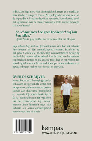 In 'Je lichaam liegt niet' laat Jeroen Bouman zien hoe het lichaam functioneert als één samenhangend systeem. Inzichten op het gebied van fascia, ademhaling, zenuwstelsel en beweging verbindt hij tot een helder geheel. Aan de hand van herkenbare voorbeelden, testen en praktische tools leer je van voeten tot hoofd signalen van je lichaam te duiden, patronen te herkennen en bewuste keuzes te maken voor herstel en prestatie.