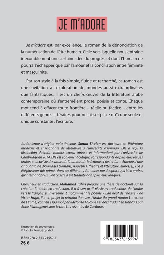 Je m'adore est, par excellence, le roman de la dénonciation de la numérisation de l'être humain. Celle vers laquelle nous entraîne inexorablement une certaine idée du progrès, et dont l'humain ne pourra s'échapper que par l'amour et la conciliation entre féminité et masculinité. Par son style à la fois simple, fluide et recherché, ce roman est une invitation à l'exploration de mondes aussi extraordinaires que fantastiques. Il est un chef-d'oeuvre de la littérature arabe contemporaine où s'entremêlent prose, poésie et conte. Chaque mot tend à effacer la frontière entre les différents genres littéraires pour ne laisser place qu'à une seule et unique constante: l'écriture.