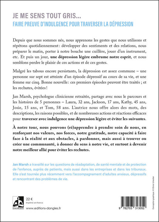 Depuis que nous sommes nés, nous apprenons les gestes que nous utilisons et répétons quotidiennement : développer des sentiments et des relations, nous préparer le matin, porter à notre bouche une cuillère, jouer d’un instrument, etc. Et puis un jour, une dépression légère embrume notre esprit, et nous semblons perdre le plaisir de ces actions et de ces gestes. Malgré les tabous encore persistants, la dépression est assez commune – une personne sur sept est atteinte d’un épisode dépressif au cours de sa vie, et une femme sur cinq. Bonne nouvelle : ces premiers épisodes peuvent être traités ; et les rechutes, évitées ! Jan Marsh, psychologue clinicienne retraitée, partage avec nous le parcours et les histoires de 5 personnes – Laura, 32 ans, Jackson, 17 ans, Kathy, 45 ans, Josie, 15 ans, et Tom, 58 ans. L’autrice nous offre alors des mots, des descriptions, les raisons possibles, et de nombreuses actions et réactions efficaces pour traverser avec indulgence une dépression légère et éviter les suivantes. À notre tour, nous pouvons (ré)apprendre à prendre soin de nous, en renforçant nos valeurs, nos forces, notre gratitude, notre capacité à faire face à la réalité et aux obstacles, à pardonner, mais aussi à trouver ou créer une communauté, à donner du sens à notre vie, et surtout à devenir notre meilleur allié pour éviter les rechutes.