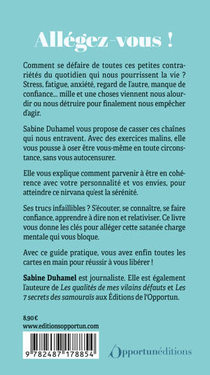 Comment se défaire de toutes ces petites contrariétés du quotidien qui nous pourrissent la vie ? Stress, fatigue, anxiété, regard de l'autre, manque de confiance... mille et une choses viennent nous alourdir ou nous détruire pour finalement nous empêcher d'agir.