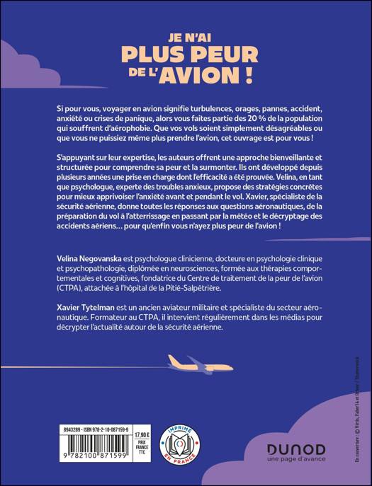 que psychologue, experte des troubles anxieux, propose des stratégies concrètes pour mieux apprivoiser l’anxiété avant et pendant le vol. Xavier, spécialiste de la sécurité aérienne, donne toutes les réponses aux questions aéronautiques, de la préparation du vol à l’atterrissage en passant par la météo et le décryptage des accidents aériens… pour qu’enfin vous n’ayez plus peur de l’avion !